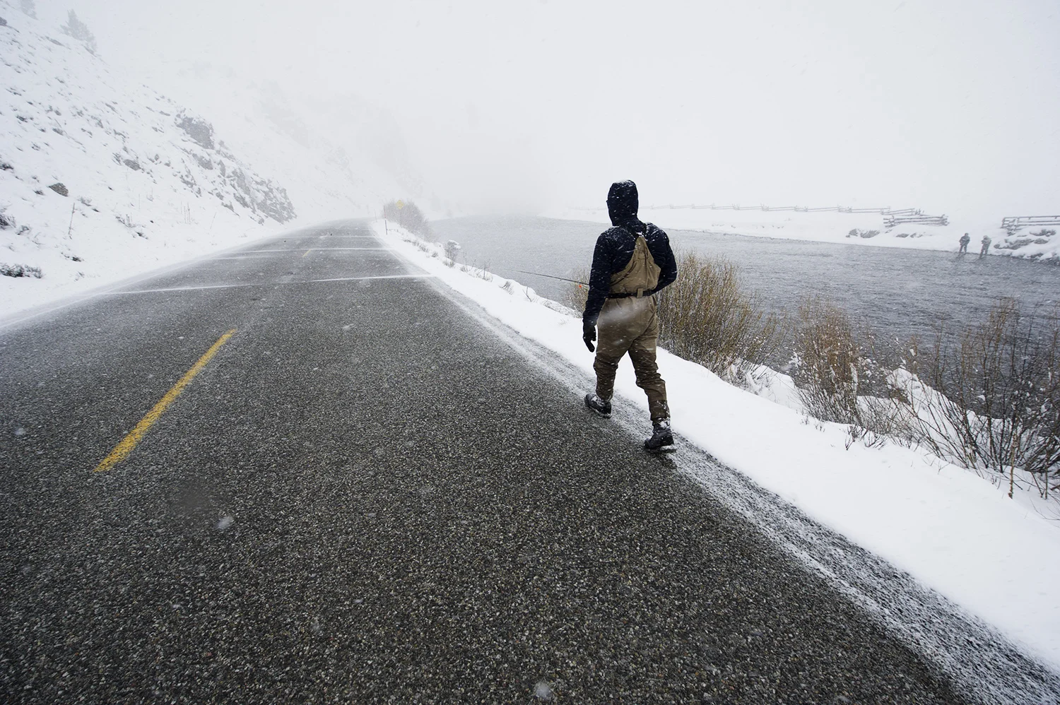 An angler takes a casual stroll down the highway to get to the Salmon River during a late winter storm.