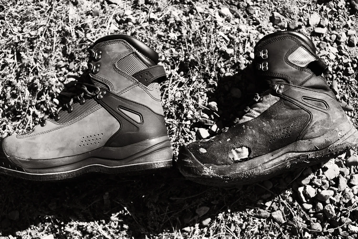 Below is not my typical image. There's no question that the Simms G3 Guide Boots are my absolute favorite wading boot I've ever owned (I don't get them for free and I'm not paid to say this). They still don't last long enough though. Below is a shot of a new boot and a newly retired boot. I wear through just over 2 pairs of these a year. That's about 120 days of use per pair of boots. I always purchase poly cord to replace the laces that come with the boots as the poly cord I purchase seems to outlast the regular laces at least 4x.