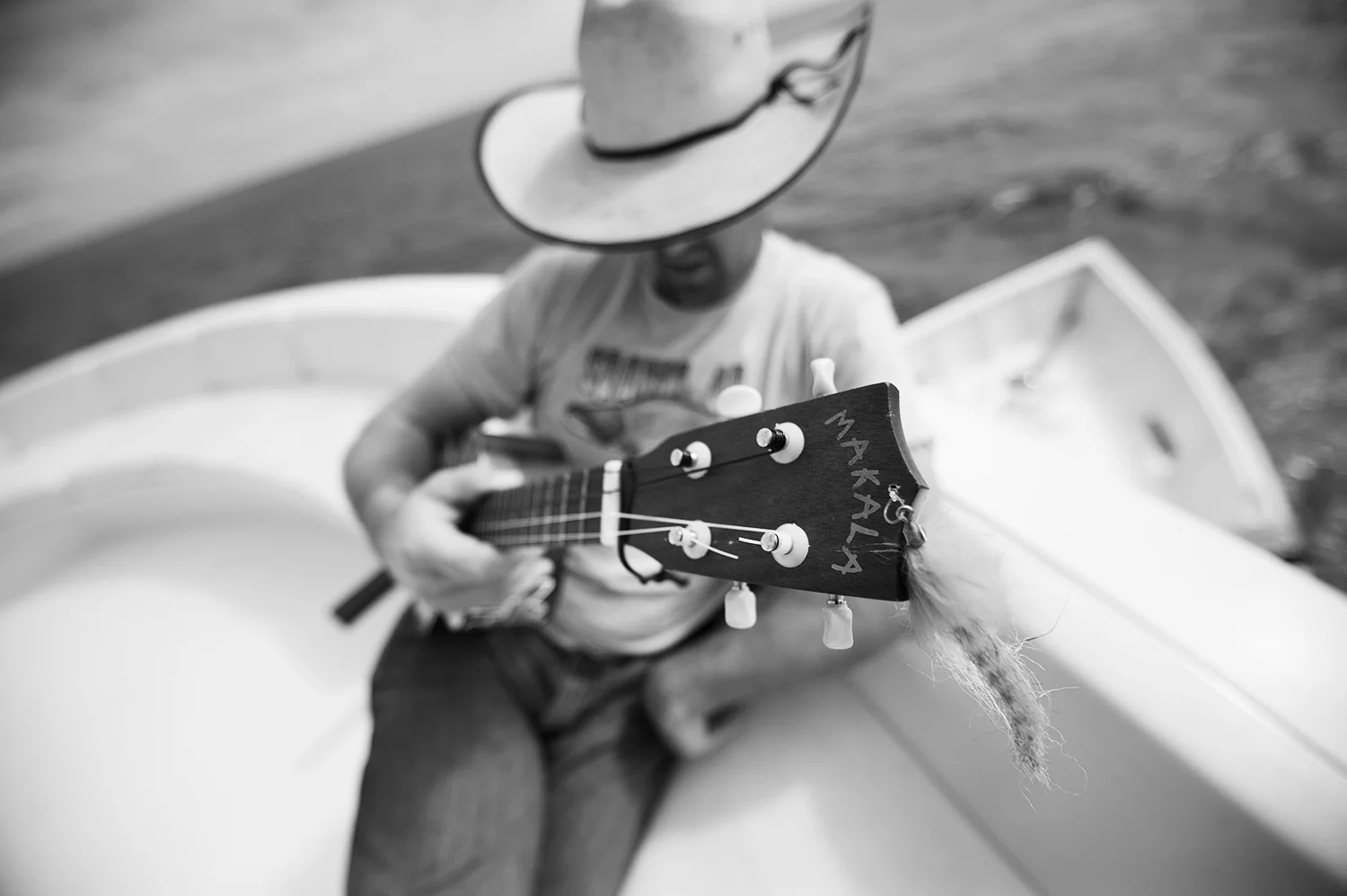 Artist Ed Anderson strums his custom, tarpon-skin ukulele. Jardines de La Reina.